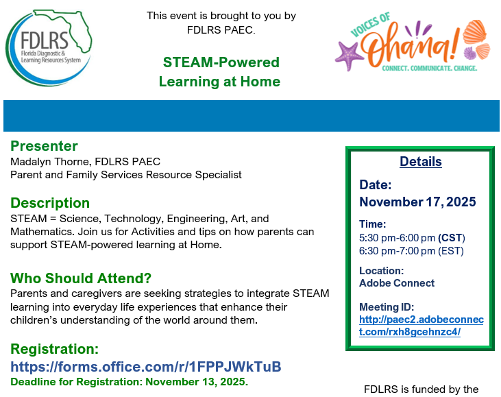 Upcoming free parent/caregiver virtual training opportunity titled : STEAM-Powered Learning at Home is being offered on November 17, 2025. Deadline for registration is November 13, 2025. You can reg. . .